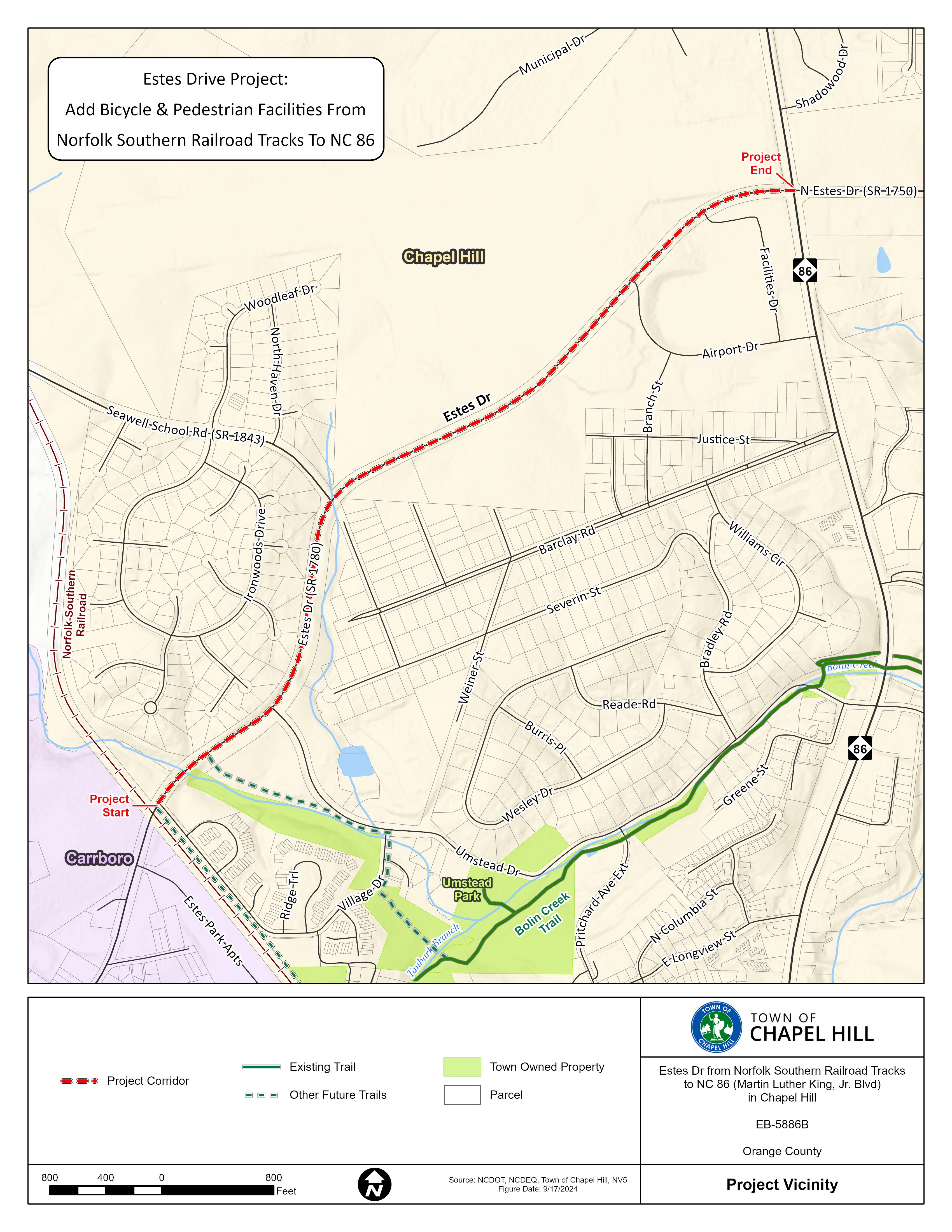 PROJECT DESCRIPTION: Add bicycle and pedestrian infrastructure to Estes Drive Extension between MLK Jr. Blvd and the Carrboro border at the railroad tracks (see map below).